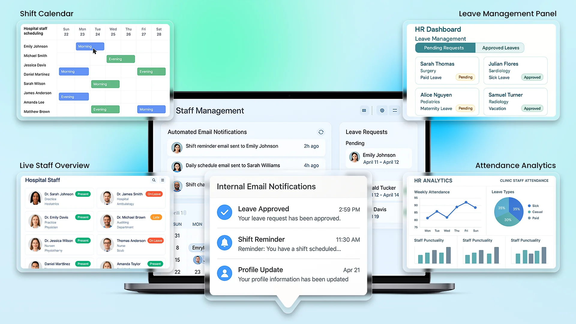 We built a fully customized Smart Staff Management System that centralizes all HR operations in one place. The platform includes structured leave tracking logic based on clinic policies and is powered by automated cron jobs to calculate and refresh leave balances every day/week/month. Internal emails like leave approvals, shift reminders, or alerts are sent automatically, freeing HR from repetitive tasks.